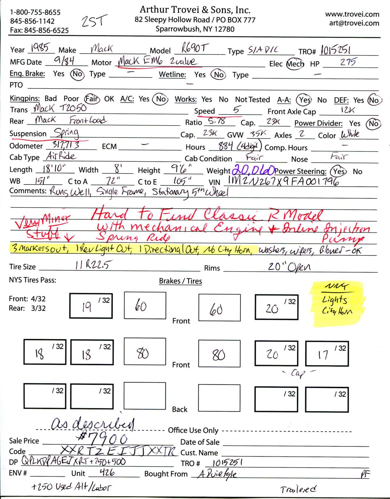 ![]() ![]() ![]() ![]() ![]() ![]() ![]() ![]() ![]() ![]() ![]() ![]() ![]() ![]() ![]() ![]() ![]() ![]() ![]() ![]() 1985 Mack R690T Single Axle Day Cab Tractor![]() Year: 1985 Make: Mack Model: R690T Type: Single Axle Day Cab Tractor VIN: 1M2N267X9FA001796 Motor: Mack EM6 2 Valve Mech 275 HP Air to Air: Yes Air Conditioning: No Engine Brake: No DEF: No Transmission: Mack T2050 5 Speed PTO: N/A Front Axle: 12,000 lb Rear: Mack Front Load 23,000 lb Ratio: 5.78 Power Divider: No Suspension: Spring 23,000 lb Tires: 11R22.5 Rims: 20" Open Odometer Reading: 317,713 ECM Reading: Hour Meter Reading: 884 (4 Digit) ECM Hour Reading: Length: 18'10" Width: 8' Height: 9'6" Wheelbase: 151" Cab to Axle: 72" Cab to End: 105" Weight: 20,060 lb (Concrete Counterweight) GVW: 35,000 lb Added Details: Runs Well, Single Frame, Stationary 5th Wheel Price: $7,900 as is as described NNY 2STXXTEIJJXXTRQPLKDPAGEJXRT+750+500+250 Terms of Sale