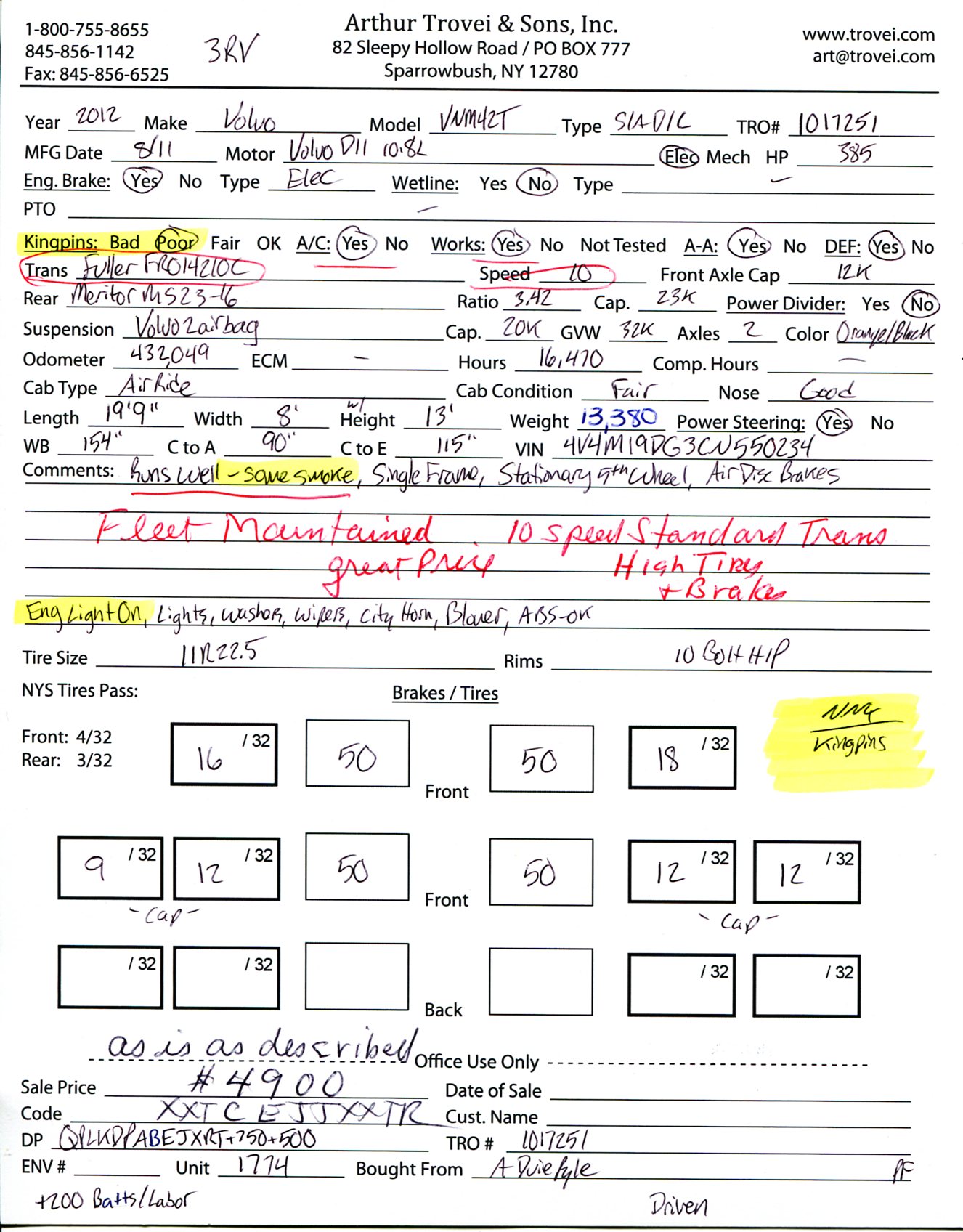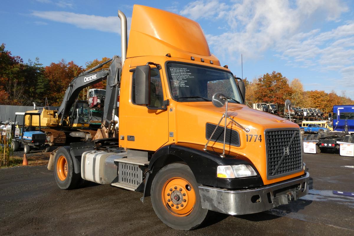 Inventory # 1017251Year: 2012 Make: Volvo Model: VNM42T Type: Single Axle Day Cab Tractor VIN: 4V4M19DG3CN550234 Motor: Volvo D11 10.8L Elec 385 HP - Engine Light On Air to Air: Yes Air Conditioning: Yes (Works) Engine Brake: Electronic DEF: Yes Transmission: Fuller FRO14210C 10 Speed PTO: No Front Axle: 12,000 lb Rear: Meritor MS23-16 23,000 lb Ratio: 3.42 Power Divider: No Suspension: Volvo 2 Air Bag 20,000 lb Tires: 11R22.5 Rims: 10 Bolt Hub Pilot - steel Odometer Reading: 432,049 ECM: Hour Meter Reading: 16,470 ECM Hour Reading: Length: 19'9" Width: 8' Height w/ Fairing: 13' Wheelbase: 154" Cab to Axle: 90" Cab to End: 115" Weight: 13,380 lb GVW: 32,000 lb Added Features: Runs Well - Some Smoke, Single Frame, Stationary 5th Wheel, Air Disc Brakes Price: $4,900 as is as described NNY 3RVXXTCEJJXXTRQPLKDPABEJXRT+750+500+200 Terms of Sale