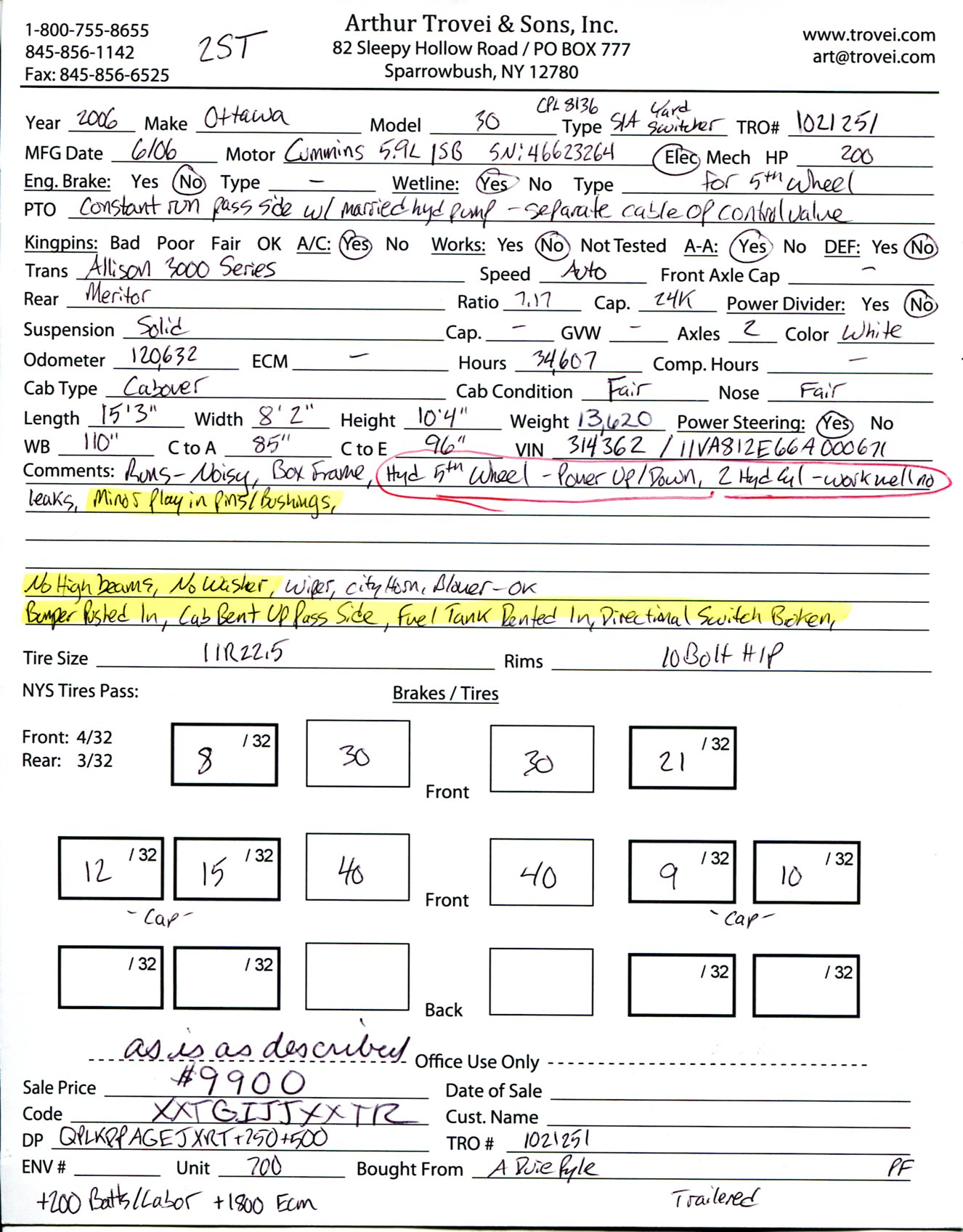 Inventory # 1021251Year: 2006 Make: Ottawa Model: 30 Type: Single Axle Yard Switcher VIN: 314362 / 11VA812E66A000671 Motor: Cummins ISB 5.9L Elec 200 HP SN: 46623264 CPL 8136 Air to Air: Yes Air Conditioning: Yes (Not Working) DEF: No Wetline: Hydraulics For 5th Wheel PTO: Constant Run Passenger Side With Married Hydraulic Pump - Separate Cable Operated Control Valve Transmission: Allison 3000 Series Automatic Rear: Meritor Ratio: 7.17 Suspension: Solid Ride Tires: 11R22.5 Rims: 10 Bolt Hub Pilot - Steel Odometer Reading: 120,632 ECM: Hour Meter Reading: 34,607 Length: 15'3" Width: 8' Height: 10'4" Wheelbase: 110" Cab to Axle: 85" Cab to End: 96" Weight: 13,620 lb GVW: Added Details: Runs - Noisy, Box Frame, Hydraulic 5th Wheel - Power Up / Power Down - 2 Hydraulic Cylinders, Works Well, No Leaks, Minor Play In Pins / Bushings Price: $9,900 as is as described NNY Has Title 2STXXTGIJJXXTRQPLKDPAGEJXRT+750+500+200 Print This Page | Back to Yard Switcher Inventory | Ask A Question Terms of Sale
