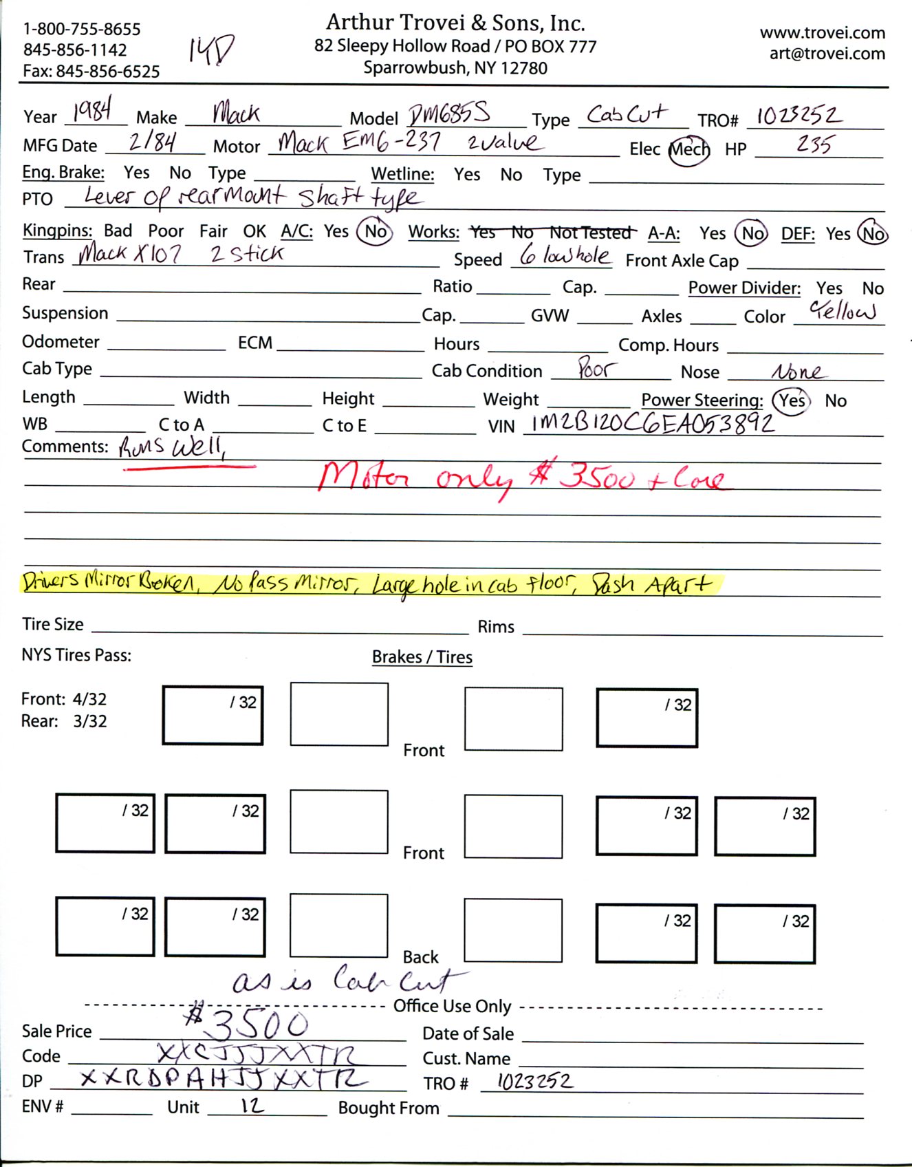 Inventory # 1023252Year: 1984 Make: Mack Model: DM685S Type: Cab Cut VIN: 1M2B120C6EA053892 Motor: Mack EM6-237 2 Valve Mech 235 HP ($3,500 + Core) Air to Air: No Air Conditioning: No Engine Brake: No Transmission: Mack X107 2 Stick 6 Speed Low Hole PTO: Lever Operated Rear Mount - Shaft Type Front Axle: Odometer Reading: Dash Apart ECM Reading: Hour Meter Reading: ECM Hour Reading: Added Details: Runs Well, Dash Apart, Hole In Cab Floor, Drivers Mirror Broken, No Passenger Mirror Price: $3,500 as is Whole 1YDXXCJJJXXTRQPLKDPAHJJXXT+750 Terms of Sale