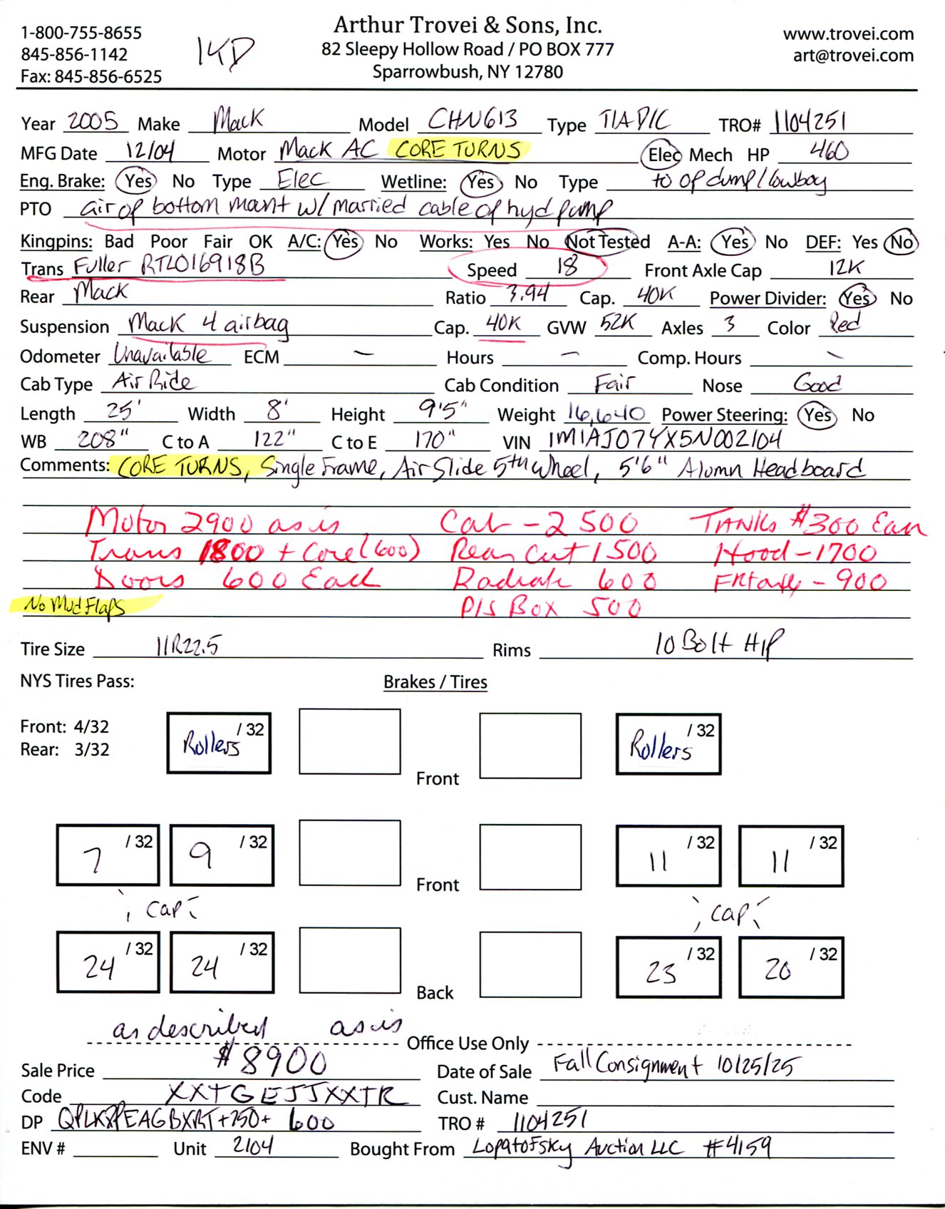 Inventory # 1104251Year: 2005 Make: Mack Model: CHN613 Type: Tandem Axle Day Cab Tractor VIN: 1M1AJ07YX5N002104 Motor: Mack AC Elec 460 HP - CORE TURNS DOES NOT RUN Air to Air: Yes Air Conditioning: Yes (Not Tested) Engine Brake: Elec Transmission: Fuller RTLO16918B 18 Speed PTO: Air Operated Bottom Mount With Married Cable Operated Hydraulic Pump Wetline: To Operate Dump / Lowboy Front Axle: 12,000 lb Rear: Mack 40,000 lb Ratio: 3.94 Power Divider: Yes Suspension: Mack 4 air bag 40,000 lb Tires: 11R22.5 Rims: 10 Bolt Hub Pilot Odometer Reading: Unavailable ECM Reading: Hour Meter Reading: ECM Hour Reading: Length: 25' Width: 8' Height: 9'5" Wheelbase: 208" Cab to Axle: 122" Cab to End: 170" Weight: 16,640 lb GVW: 52,000 lb Added Details: CORE TURNS DOES NOT RUN, Single Frame, Air Slide 5th Wheel Price: $8,900 as is as described 1YDXXTGEJJXXTRQPLKDPEAGBXRT+750+600 Terms of Sale
