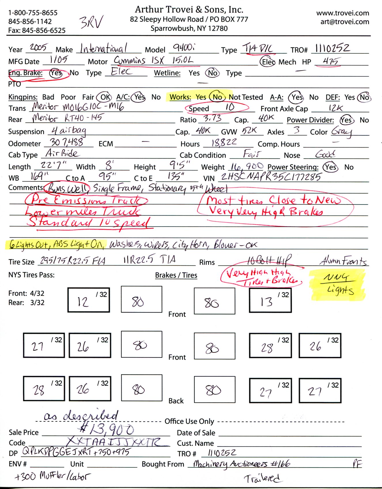 Inventory # 1110252Year: 2005 Make: International Model: 9400i Type: Tandem Axle Day Cab Tractor VIN: 2HSCNAPR35C177285 Motor: Cummins ISX 15.0L Elec 475 HP Air to Air: Yes DEF: No Air Conditioning: Yes (Not Working) Engine Brake: Electronic Transmission: Meritor M016G10C-M16 10 Speed PTO: No Wetline: No Front Axle: 12,000 lb Rear: Meritor RT40-145 40,000 lb Ratio: 3.73 Power Divider: Yes Suspension: 4 Air Bag 40,000 lb Tires: 295/75R22.5 F/A 11R22.5 T/A Rims: 10 Bolt Hub Pilot - Aluminum Fronts Odometer Reading: 307,488 ECM: Hour Meter Reading: 18,822 ECM Hour Reading: Length: 22'7" Width: 8' Height: 9'5" Wheelbase: 169" Cab to Axle: 95" Cab to End: 135" Weight: 16,900 lb GVW: 52,000 lb Added Features: Runs Well, Single Frame, Stationary 5th Wheel Price: $13,900 as described NNY 3RVXXTAAIJJXXTRQPLKDPGGEJXRT+750+975+300 Print This Page | Back to Day Cab Tractors Inventory | Ask A Question Terms of Sale