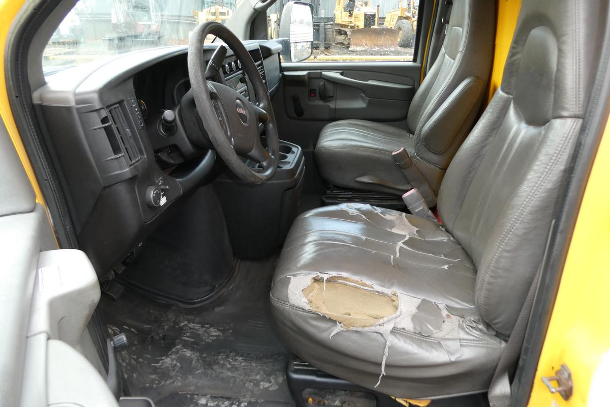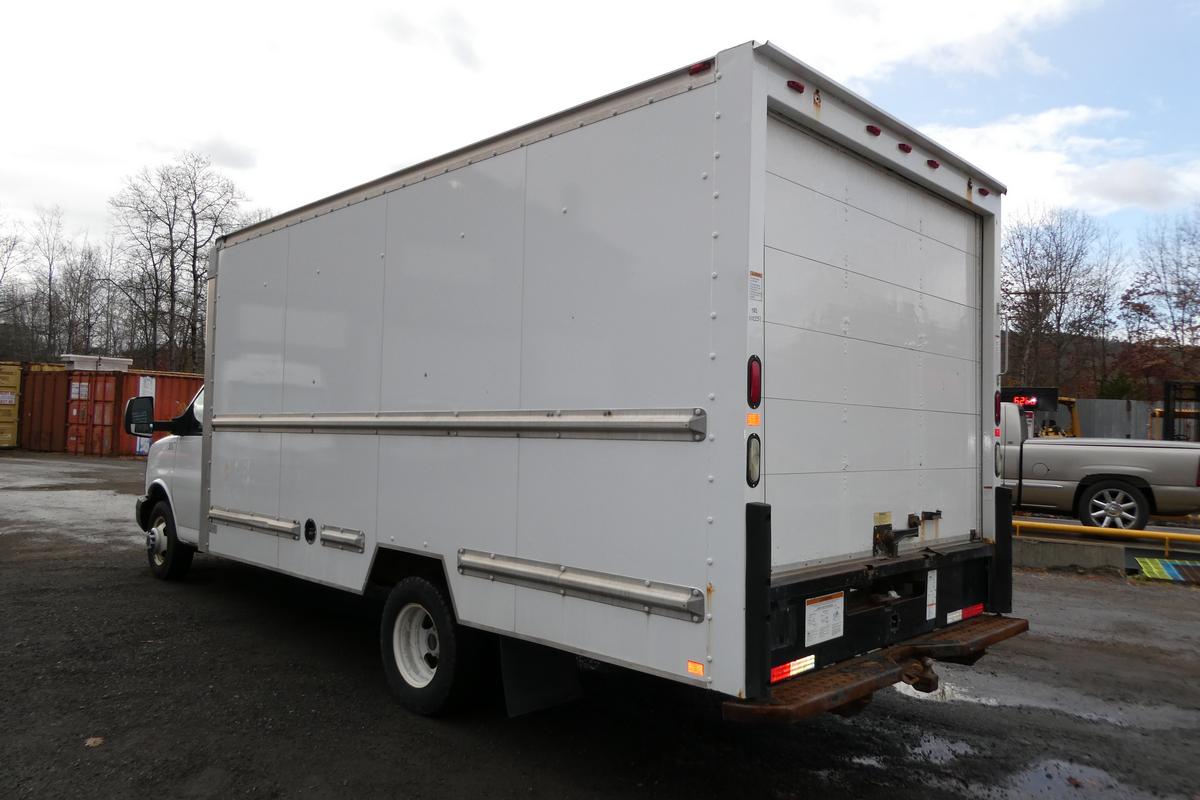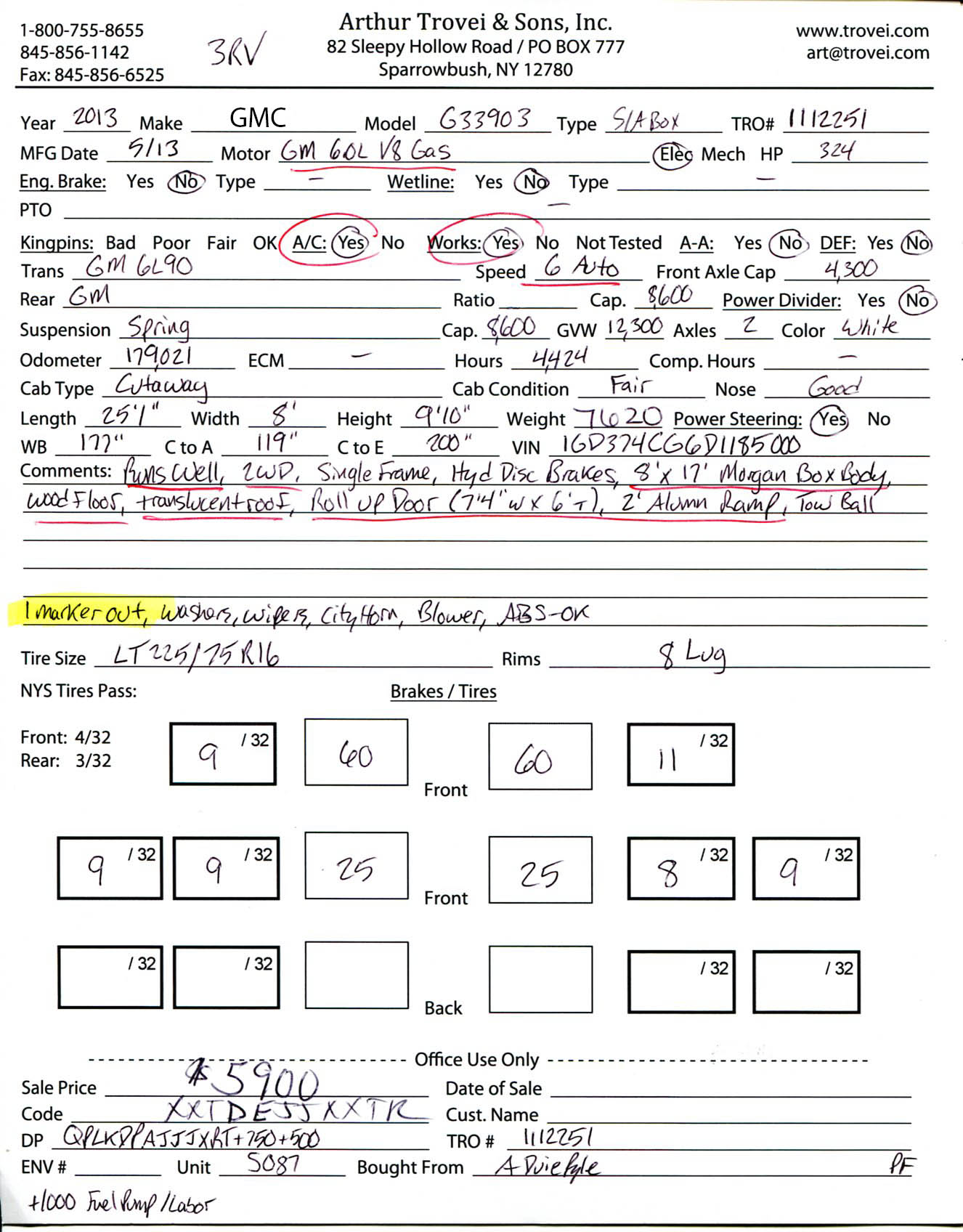 Inventory # 1112251Year: 2013 Make: GMC Model: G33903 Type: Single Axle Box Truck VIN: 1GD374CG6D1185000 Motor: GM 6.0L V8 Gas Elec 324 HP Engine Brake: No Air to Air: No DEF: No Air Conditioning: Yes (Works) Transmission: GM GL90 6 Speed Automatic PTO: No Front Axle: 4,300 lb Rear: GM 8,600 lb Ratio: Suspension: Spring 8,600 lb Tires: LT225/75R16 Rims: 8 Lug Odometer Reading: 179,021 ECM: Hour Meter Reading: 4,424 Computer Hour Reading: Length: 25'1" Width: 8' Height: 9'10" Wheelbase: 177" Cab to Axle: 119" Cab to End: 200" Weight: 7,620 lb GVW: 12,300 lb Box Details: 8' Wide x 17' Long Morgan Box Body - Roll Up Door (7'4" W x 6' T), Steel Surround, Wood Floor, Translucent Roof Added Details: Runs Well, 2WD, Single Frame, Hydraulic Disc Brakes, 2' Aluminum Ram, Tow Ball Price: $5,900 3RVXXTDEJJXXTRQPLKDPAJJJXRT+750+500+1000 Terms of Sale