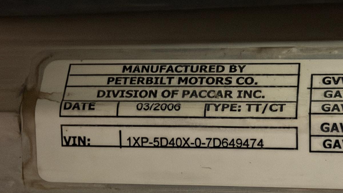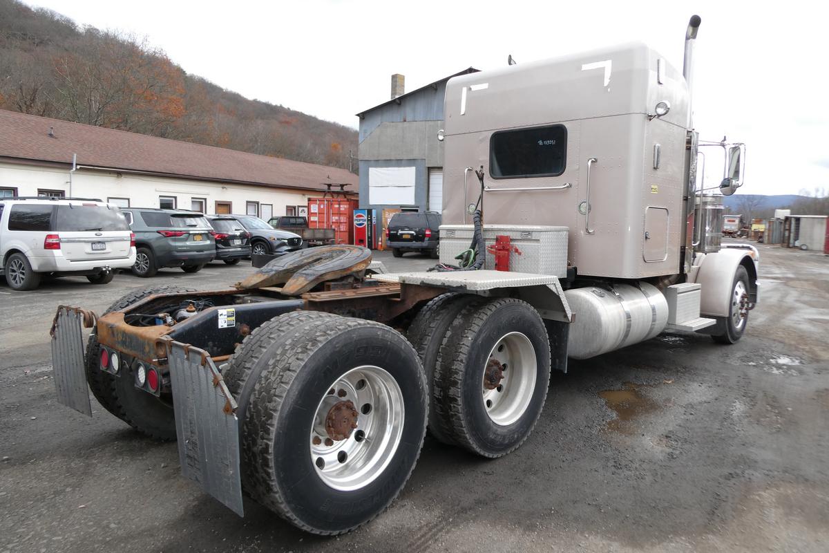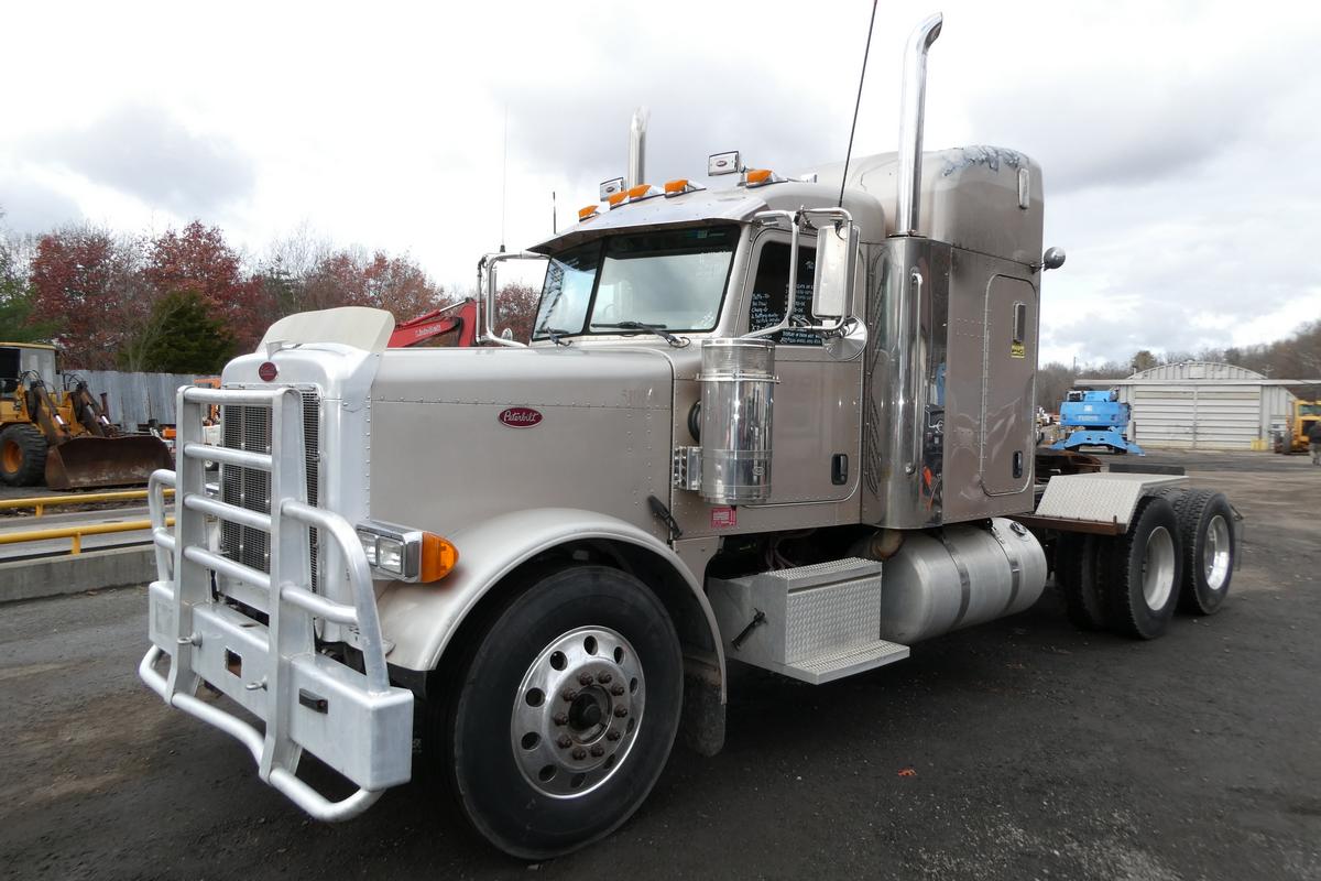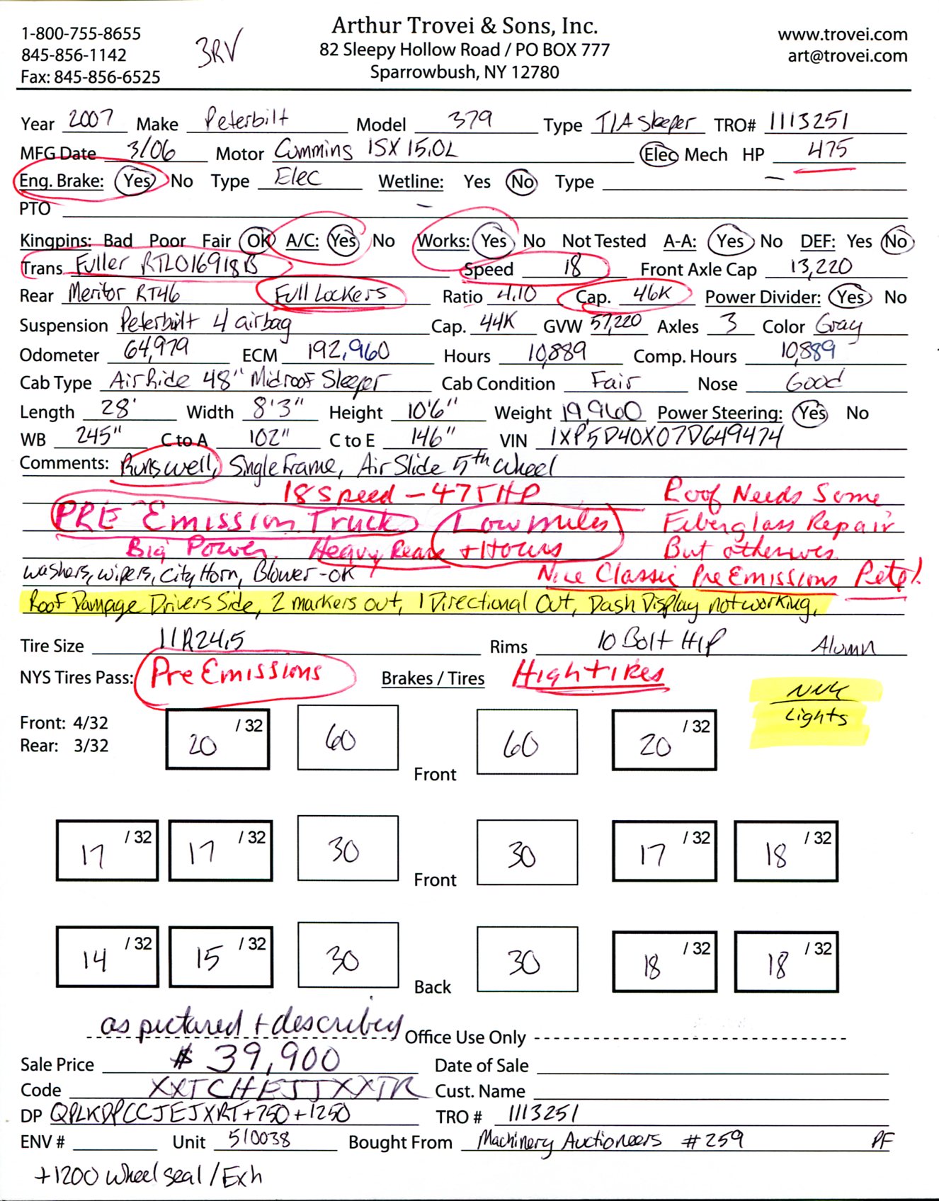 Inventory # 1113251Year: 2007 Make: Peterbilt Model: 379 Type: Tandem Axle Sleeper Cab Tractor VIN: 1XP5D40X07D649474 Motor: Cummins ISX 15.0L Elec 475 HP Air to Air: Yes Air Conditioning: Yes (Works) Engine Brake: Electronic Wetline: No Transmission: Fuller RTLO16918B 18 Speed PTO: No Front Axle: 13,220 lb Rear: Meritor RT46 46,000 lb W/ Full Lockers Ratio: 4.10 Power Divider: Yes Suspension: Peterbilt 4 air bag 44,000 lb Tires: 11R24.5 Rims: 10 Bolt Hub Pilot - Aluminum Odometer Reading: 64,979 ECM: 192,960 Hour Meter Reading: 10,889 Computer Hour Reading: 10,889 Length: 28' Width: 8'3" Height: 10'6" Wheelbase: 245" Cab to Axle: 102" Cab to End: 146" Weight: 19,960 lb GVW: 57,220 lb Sleeper Details: Air Ride 48" Mid Roof Sleeper Added Details: Runs Well, Single Frame, Air Slide 5th Wheel Price: $39,900 as described NNY 3RVXXTCHEJJXXTRQPLKDPCCJEJXRT+750+1250+1200 Terms of Sale